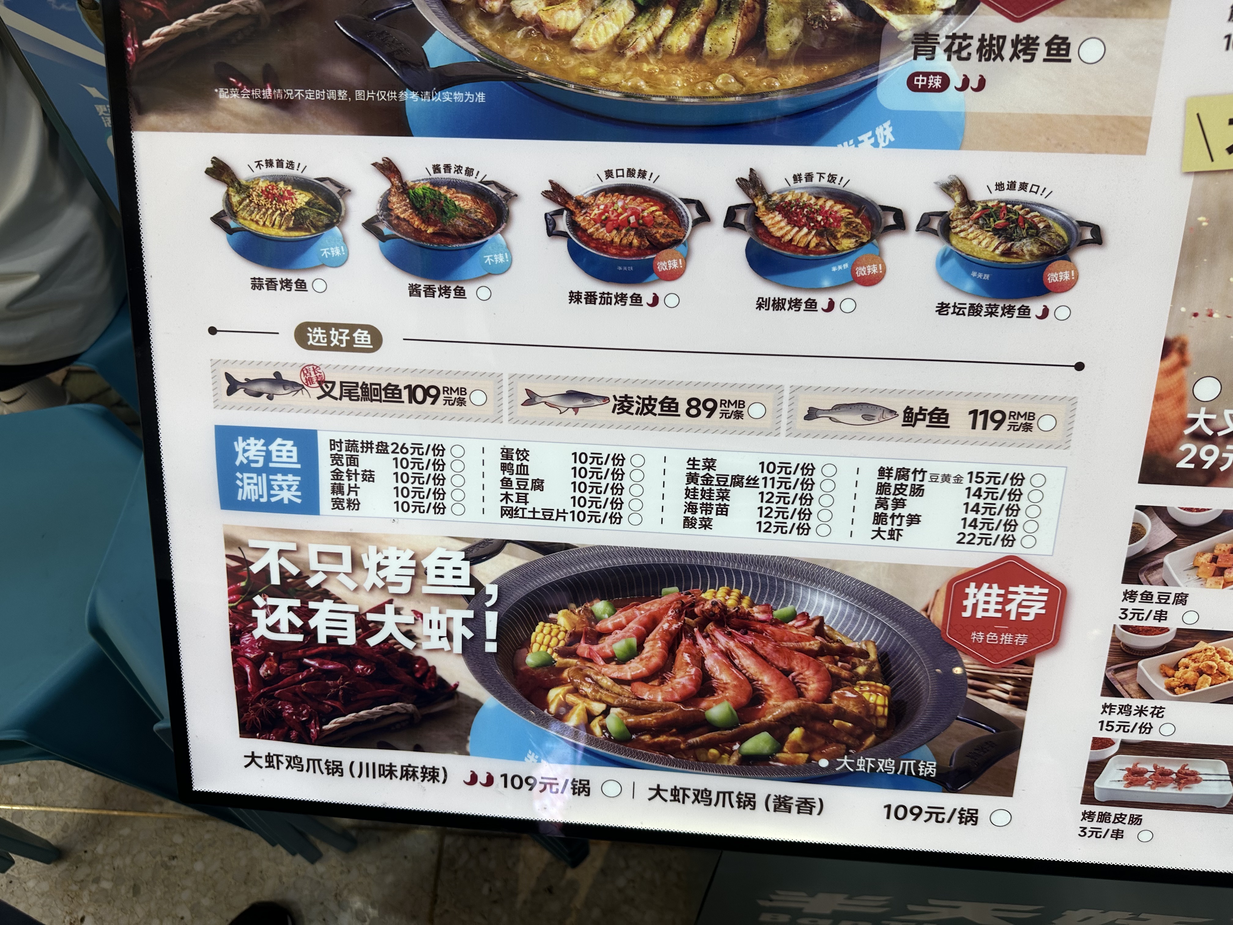 음식점에서는 카오위에 들어가는 생선 종류와 소스 종류를 선택할 수 있었는데 우리는 마라소스와 위 사진의 109위안짜리 생선을 선택했다.